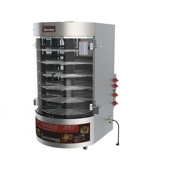 Fabricado externamente em aço inox AISI 430 escovado e internamente em aço SAE 1020 revestido com pintura epoxi. Possui a bacia e porta dos queimadores e suporte central dos infravermelhos revestidos com pintura esmalte pigmentado (auto-limpante). Portas de vidros curvos temperados que proporciona maior visualização interna. Equipado com o exclusivo sistema "Central Infrared" que permite o douramento central do assado. Possui bandeja coletora de gordura. Possui rodízios. Acompanha grade. Equipamento bivolt em 60 Hz.
