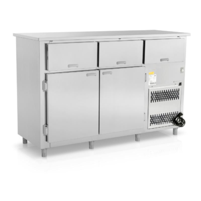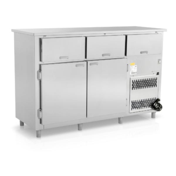 Balcão para refrigeração de 2 barris de 50L de chopp com gavetas refrigeradas para copos