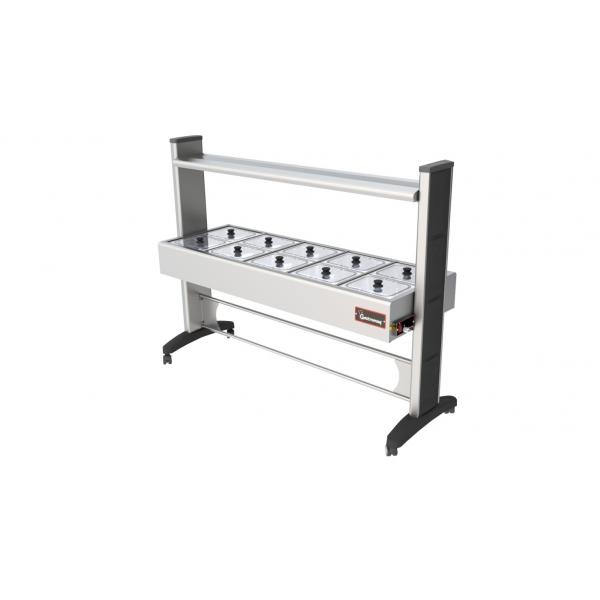 Balcão Térmico fabricado com tanque em Aço Galvanizado e externamente com aço Inox 430 escovado. Resfriamento através de bolsas de gelo X que já acompanham o produto. Disponíveis com 6, 8 e 10 cubas de aço Inox Gastronômicas, com tampas Inox ou vidros. Tecla para acendimento de 2 lâmpadas. Suspenso por colunas fabricadas de Chapas de Aço SAE 1020 revestida com pintura epóxi Branca ou em Inox e com fechamento em nylon injetado. Fechamento superior em Inox 430 Escovado com iluminação ou Fechamento Superior em Vidro Temperado que dispensa a utilização da iluminação. Disponíveis com ligação 127v ou 220v.Acompanha rodízio com freio.