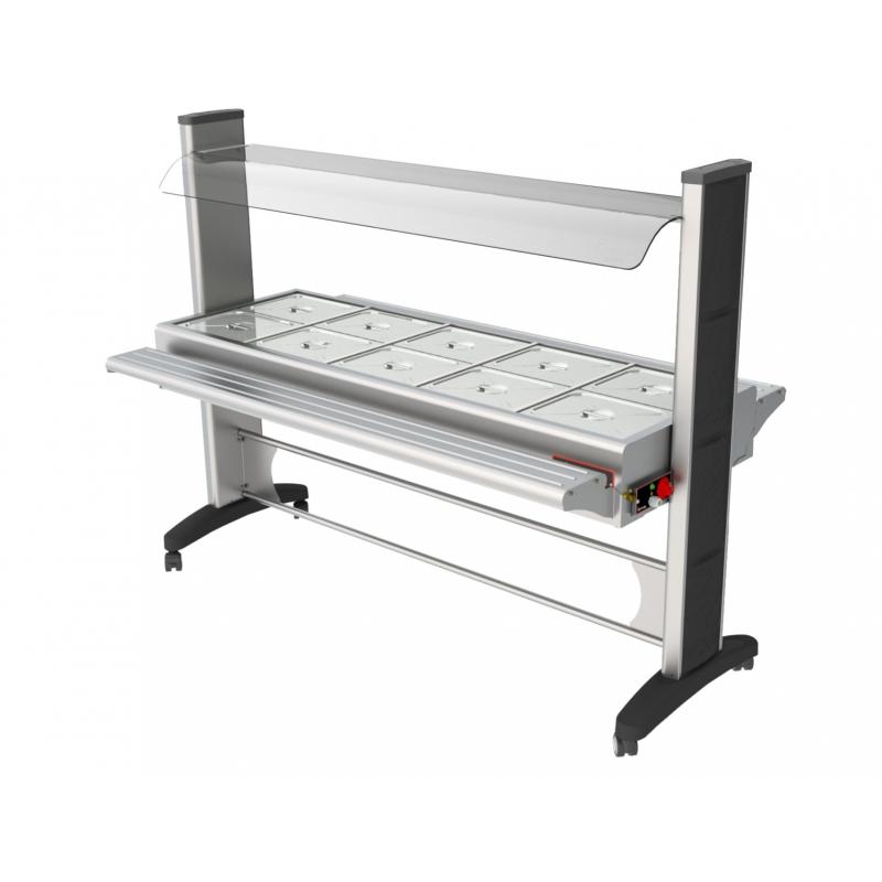 Balcão Térmico fabricado com tanque estancado para Banho Maria em Aço Inox 430 e Externamente com aço Inox 430. Escovado com dreno d'água. Disponíveis com 6, 8 e 10 cubas de aço Inox Gastronômicas, com tampas Inox ou Vidros, aquecido com resistência tubular em aço Inox 304 controlado pelo termostato 20°C à 120°C e Lâmpada Piloto para controle do aquecimento. Tecla para acendimento de 2 lâmpadas. Suspenso por colunas fabricadas de Chapas de Aço SAE 1020 revestida com pintura epóxi Branca e com fechamento em aço inox430 escovado. Fechamento superior em Inox 430 Escovado com iluminação ou Fechamento Superior em Vidro Temperado que dispensa a utilização da iluminação. Disponíveis com ligação 110v ou 220v.Acompanha rodízio com freio.