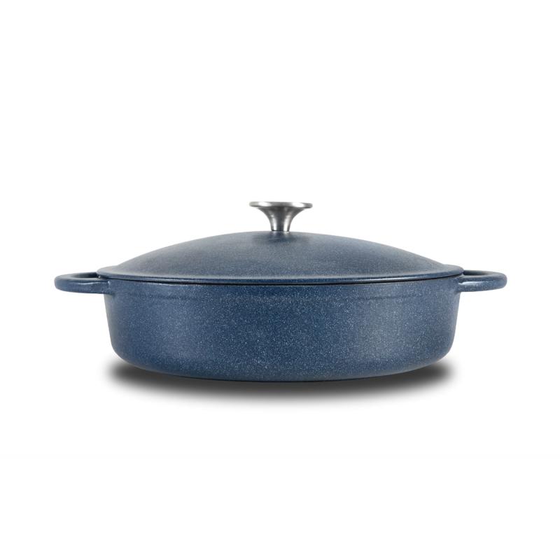 Baixinha, mas resistente! A caçarola baixa Fusion possui corpo e tampa em ferro fundido, perfeito para manter o calor por mais tempo ao cozinhar ensopados de peixe ou carnes com batata, além de ser garantia de qualidade e durabilidade. A estrutura em ferro também ajuda a preservar os nutrientes dos alimentos, e o esmaltado na parte interna da caçarola facilita a limpeza, podendo ir à lava-louças. Os modelos da linha Fusion podem ser utilizados em todos os tipos de fogões e estão disponíveis na cor azul, unindo a tradição da panela de ferro com beleza das cores na cozinha. A caçarola mede Ø28,3 x 7 cm e possui 3,3 litros de capacidade.