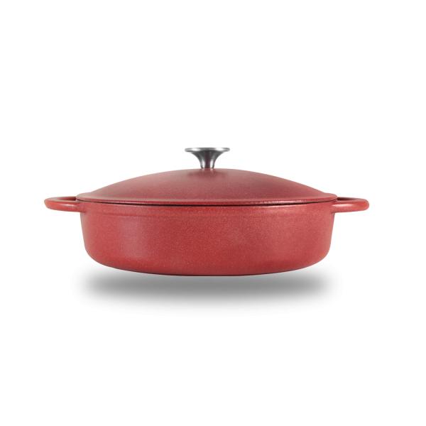 Baixinha, mas resistente! A caçarola baixa Fusion possui corpo e tampa em ferro fundido, perfeito para manter o calor por mais tempo ao cozinhar ensopados de peixe ou carnes com batata, além de ser garantia de qualidade e durabilidade. A estrutura em ferro também ajuda a preservar os nutrientes dos alimentos, e o esmaltado na parte interna da caçarola facilita a limpeza, podendo ir à lava-louças. Os modelos da linha Fusion podem ser utilizados em todos os tipos de fogões e estão disponíveis na cor vermelho, unindo a tradição da panela de ferro com beleza das cores na cozinha. A caçarola mede Ø28,3 x 7 cm e possui 3,3 litros de capacidade.