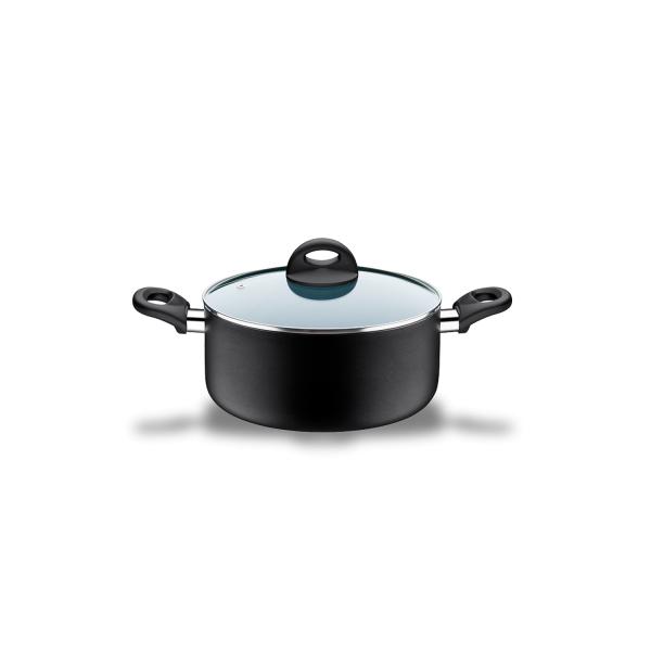 A caçarola é a peça de cozinha ideal para risotos, estrogonofes e molhos desde o fogão até o momento de servir, pois as duas alças facilitam o transporte e não ocupam espaço à mesa. Parte da linha Ceramic Life 2.5, ela conta com revestimento cerâmico, que não libera elementos químicos no uso e ainda é antiaderente, o que requer menos óleo no preparo das refeições, além de ser fácil de lavar. Já o alumínio 2.5 mm absorve o calor lentamente, permitindo um cozimento uniforme dos alimentos e economizando energia. As alças em baquelite têm revestimento Soft-Touch, macio e antitérmico. A tampa de vidro temperado conta com saída para o vapor, para espiar a comida sem prejudicar o cozimento. Além de tudo, o design arredondado e a pintura siliconada fica linda à mesa. Nesta versão, a caçarola tem 20x10,5 cm, capacidade de 3,55 litros e a cor é preta.