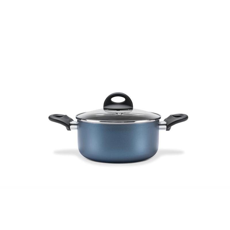 Prática e segura, a caçarola da linha Mint, com 20x10 cm e capacidade de 2,65 litros, tem estrutura de alumínio que dissipa melhor o calor, cozinhando o alimento por igual e mais rapidamente. Já o revestimento interno antiaderente não deixa o alimento grudar mesmo com uso reduzido de óleo. De quebra, o material também facilita a limpeza. A tampa é de vidro e possui saída para o vapor. Os cabos são em soft touch, facilitando o manuseio.A caçarola, que vem na cor cobalto.