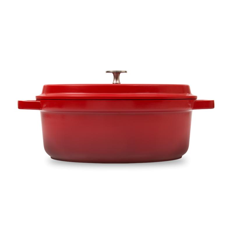 Versatilidade e beleza com um toque retrô são as marcas das caçarolas da linha Grand Gourmet. Uma chapa de inox inoxidável no fundo possibilita o uso em fogões de indução, enquanto a estrutura toda metálica facilita que as receitas sejam levadas da boca do fogão ao forno em até 180ºC, como uma carne assada com batatinhas gratinadas, por exemplo. A tampa conta ainda com sistema pinga gotas, que permite que o vapor d?água retorne ao alimento, preservando os nutrientes e o sabor. Como todos os produtos da Família Alumini, a proteção antiaderente Pro-Flon Premium permite o preparo de alimentos com menos óleo e facilita a limpeza. A caçarola é oval e está disponível na cor vermelho. Suas dimensões são 26x20x10 cm e capacidade de 3,2 litros.