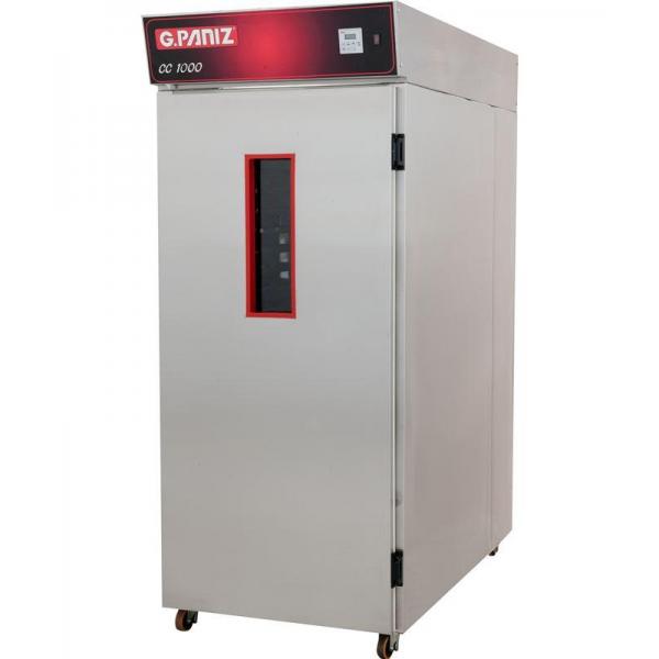 Estrutura externa em aço pré-pintado e interno aço inox 430, grades em aço inox de capacidade para 20 ou 40 bandejas, isolamento em poliuretano injetado, porta com vidro para visualização com gaxetas removíveis.