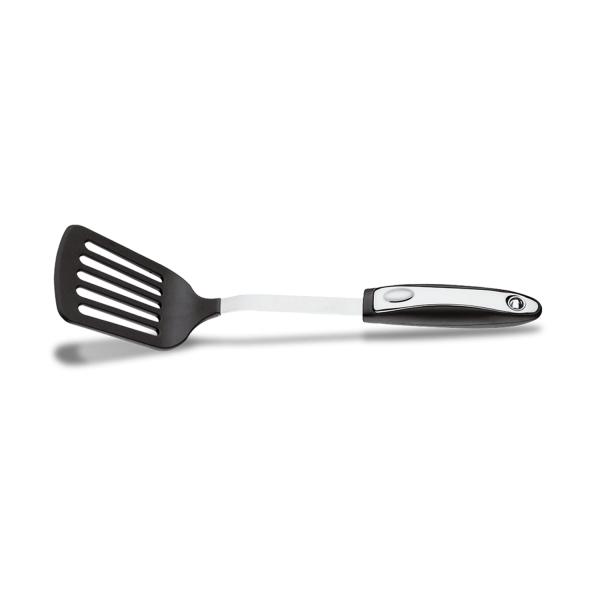 Os cozinheiros mais exigentes utilizam e aprovam: utensílios que reúnem aço inox e nylon são perfeitos para qualquer tipo de alimento e recipientes. Além da resistência e facilidade de limpar próprias do aço inox, estes objetos apresentam a leveza do nylon, que não danifica as superfícies. A espátula perfurada possui base reta, o que lhe permite servir tortas e suflês sem dificuldades. Os orifícios da base também facilitam o escoamento de alimentos preparados em água ou óleo. O bojo, em nylon, é resistente e fácil de limpar. Seu cabo em aço inox e detalhes em polipropileno possui um orifício que lhe permite pendurar a peça e mantê-la sempre à vista. O produto suporta temperaturas de até 210°C, tem 31,5cm de comprimento e está disponível em aço inox com detalhes em preto.