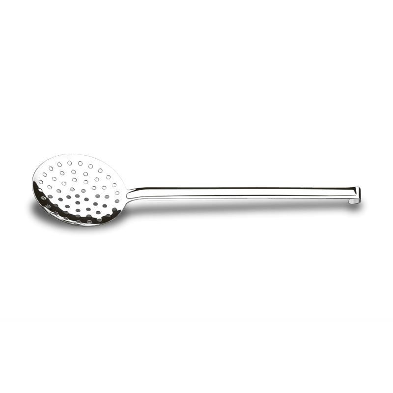 escoar alimentos preparados em água ou óleo. Seu bojo possui múltiplos orifícios e bordas levemente elevadas que fazem com que o alimento fique sequinho muito mais rápido. A peça é inteiramente produzida em aço inoxidável, um material que reúne funcionalidade e elegância: resistente e fácil de limpar, possui um sofisticado acabamento em alto brilho e pode ir à lava-louças. A espumadeira da linha Arienzo tem 34,5cm de comprimento total e cabo longo para garantir a sua segurança.