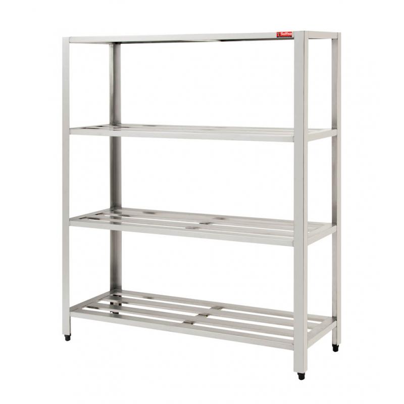Construída inteiramente em aço inox AISI 430 ou 304, 4 planos gradeados, estrutura em perfil “L” e péscom sapatas niveladoras em polietileno.