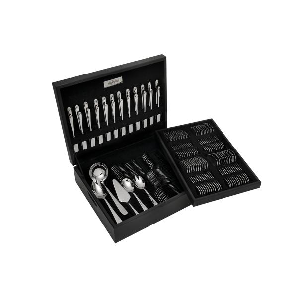Com linhas simples e modernas, o design da linha Viva deixa a decoração da sua mesa clean e elegante. O faqueiro com 125 peças é completo para servir um almoço ou jantar para amigos e familiares, incluido, inclusive, utensílios para peixe. Com ele, são servidas até 12 pessoas. A estrutura e o cabo em aço inox polido tornam a peça altamente durável e resistente, não correndo risco de oxidar e podendo inclusive ir á máquina de lavar louça. Para conservar seu faqueiro, ele vem em um estojo de madeira com espaço para cada peça.