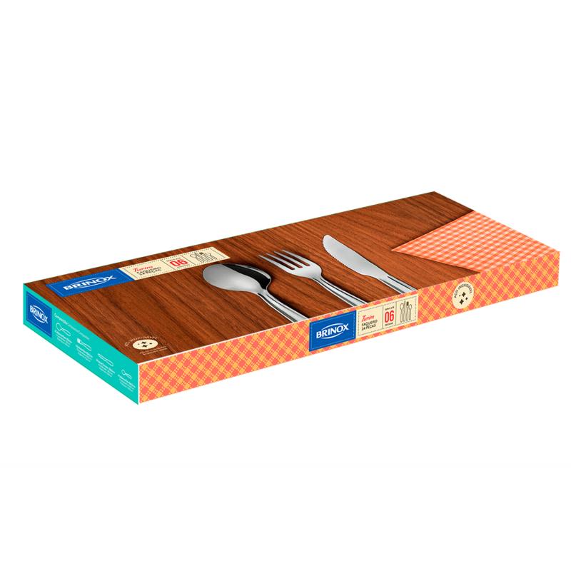 | Composição | 6 Colheres de Mesa 6 Garfos de Mesa 6 Facas de Churrasco 6 Colheres de Chá |