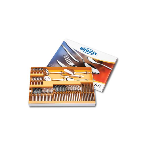 Práticos e resistentes, os talheres da linha Turim são ideais para o dia-a-dia. Os utensílios são feitos de aço inox com acabamento polido, e os cabos apresentam um friso que é marca da linha. Este faqueiro de 61 peças contém talheres para servir uma refeição para oito pessoas: colheres e garfos de mesa, facas de churrasco, colheres e garfos de sobremesa, colheres de chá e de café. Além disso, itens unitários que complementam a cozinha, como colher para arroz, espumadeira, pá para torta, garfo trinchante e concha terrina. Todos os produtos podem ir à lava-louças.