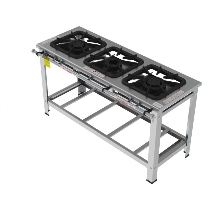 Fabricado em aço inox, possui tubulação em alumínio escovado e registros em latão cromado. Acompanha registro espera para forno, tem apenas uma entrada de gás em todos os modelos. Gás em baixa pressão e estrutura desmontável. Fabricado nas disposições Encosto podendo ser misto ou simples, também em linhas, podendo ser simples, duplo ou misto e em centro podendo ser simples, duplo ou misto. Queimadores em ferro fundido: Simples de chama dupla com diâmetro de 150mm e duplos com diâmetro de 200mm. Grelhas em ferro fundido 40x40 com 8 braços. Bandejas coletoras que privilegia a ventilação na parte inferior. Sistema de queimadores com fácil regulagem e montagem. Mesa com perfil 70mm estampada sem emendas evitando acúmulo de sujeira. Modulado. Chapa bifeteira em aço carbono. Banho Maria esmaltado. Forno opcional com porta de inox ou vidro.