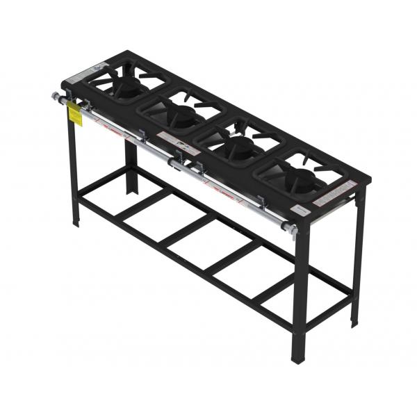 Fabricado em aço carbono, revestido com pintura epóxi texturizada na cor preta, possui tubulação em alumínio escovado e registros em latão cromado. Acompanha registro espera para forno, tem apenas uma entrada de gás em todos os modelos. Gás em baixa pressão e estrutura desmontável. Fabricado nas disposições Encosto podendo ser misto e simples e também em linhas, podendo ser simples, duplo e misto. Queimadores em ferro fundido: Simples de chama dupla com diâmetro de 130mm e duplos com diâmetro de 175mm. Grelhas em ferro fundido 30x30 com 6 braços. Bandejas coletoras que privilegia a ventilação na parte inferior. Sistema de quiemadores com fácil regulagem e montagem. Mesa com perfil 70mm estampada sem emendas evitando acúmulo de sujeira. Modulado. Chapa bifeteira em aço carbono. Banho Maria esmaltado. Forno opcional com porta de inox ou vidro.