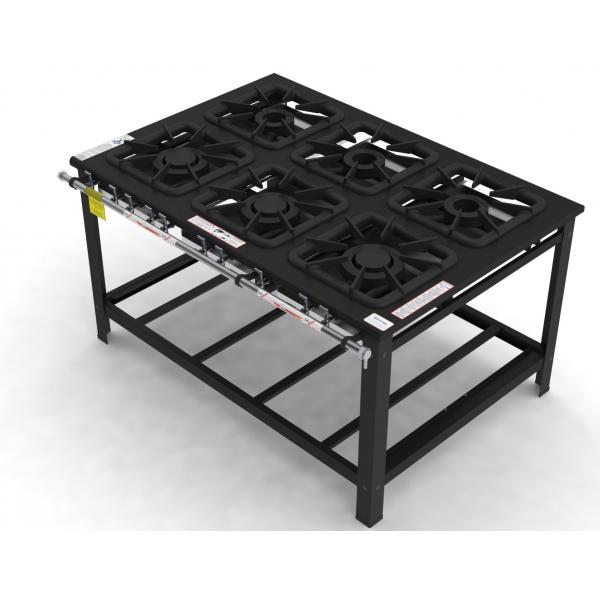 Fabricado em aço carbono, revestido com pintura epóxi texturizada na cor preta, possui tubulação em alumínio escovado e registros em latão cromado. Acompanha registro espera para forno, tem apenas uma entrada de gás em todos os modelos. Gás em baixa pressão e estrutura desmontável. Fabricado nas disposições Encosto podendo ser misto ou simples, também em linhas, podendo ser simples, duplo ou misto e em centro podendo ser simples, duplo ou misto. Queimadores em ferro fundido: Simples de chama dupla com diâmetro de 150mm e duplos com diâmetro de 200mm. Grelhas em ferro fundido 40x40 com 8 braços. Bandejas coletoras que privilegia a ventilação na parte inferior. Sistema de queimadores com fácil regulagem e montagem. Mesa com perfil 70mm estampada sem emendas evitando acúmulo de sujeira. Modulado. Chapa bifeteira em aço carbono. Banho Maria esmaltado. Forno opcional com porta de inox ou vidro.