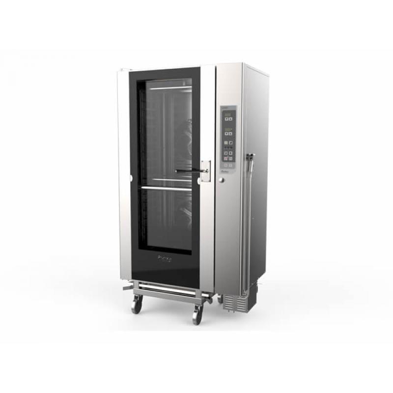 Forno Combinado a gás (Natural ou GLP) com capacidade de um carro para 20 GNs 1/1x65mm (compatível com GNs de demais profundidades e grelhas).