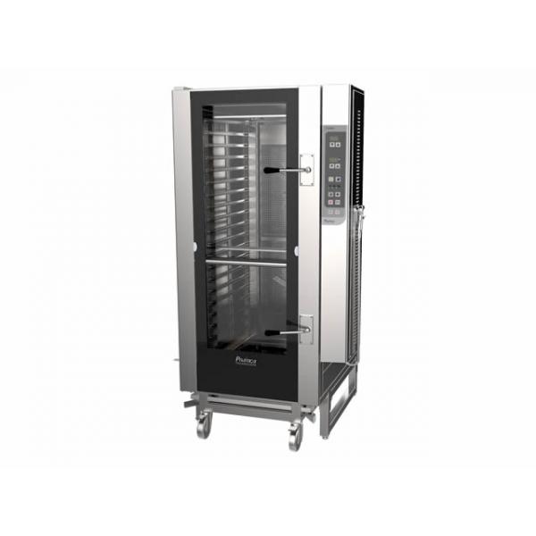Forno Combinado a gás (Natural ou GLP) com capacidade de um carro para 40 GNs 1/1x65mm (compatível com GNs de demais profundidades e grelhas).