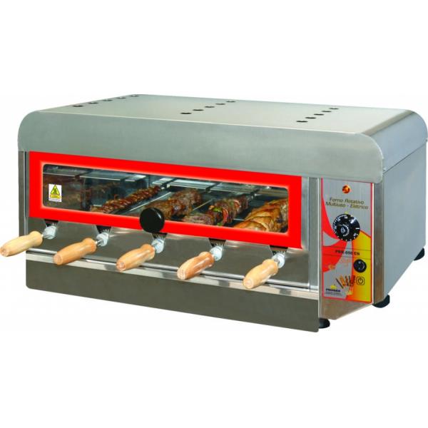 Possui espetos rotativos, grade removível e controle de temperatura automático através de termostato.