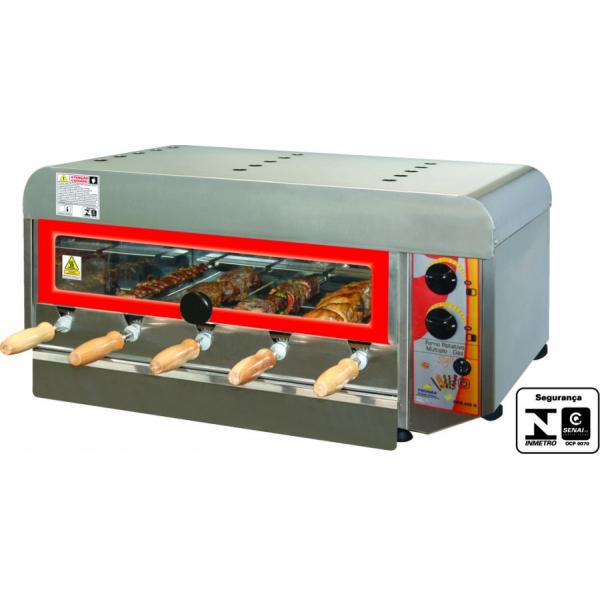 - Capacidade para 05 espetos rotativos, sendo 3 largos para carnes e 2 estreitos para coração de galinha, que acompanham o produto;