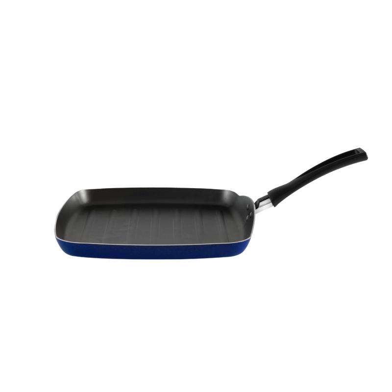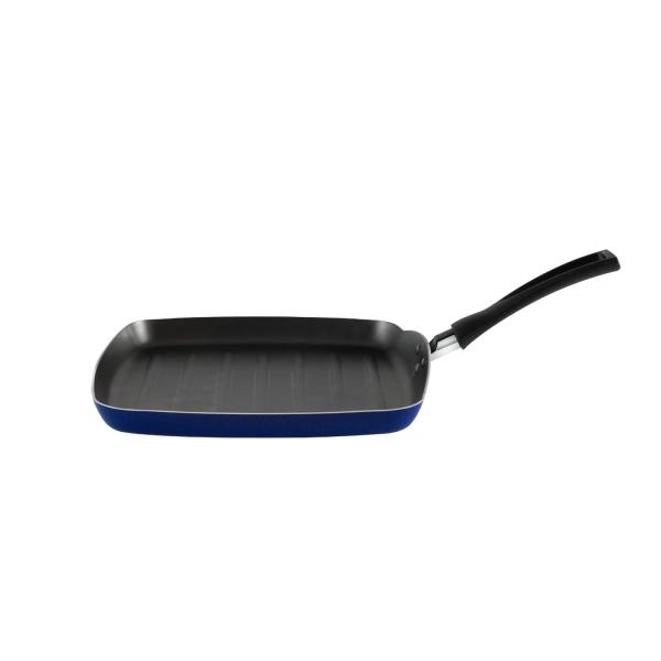 O grill quadrado facilita o preparo de grelhados no fogão, graças à estrutura de alumínio: o calor é melhor dissipado, cozinhando a carne por igual. O revestimento interno antiaderente impede o alimento de grudar mesmo com uso reduzido de óleo e torna a limpeza mais fácil. O cabo é de baquelite, que não aquece, tornando o manuseio do utensílio mais fácil e seguro. O produto está disponível na cor azul.