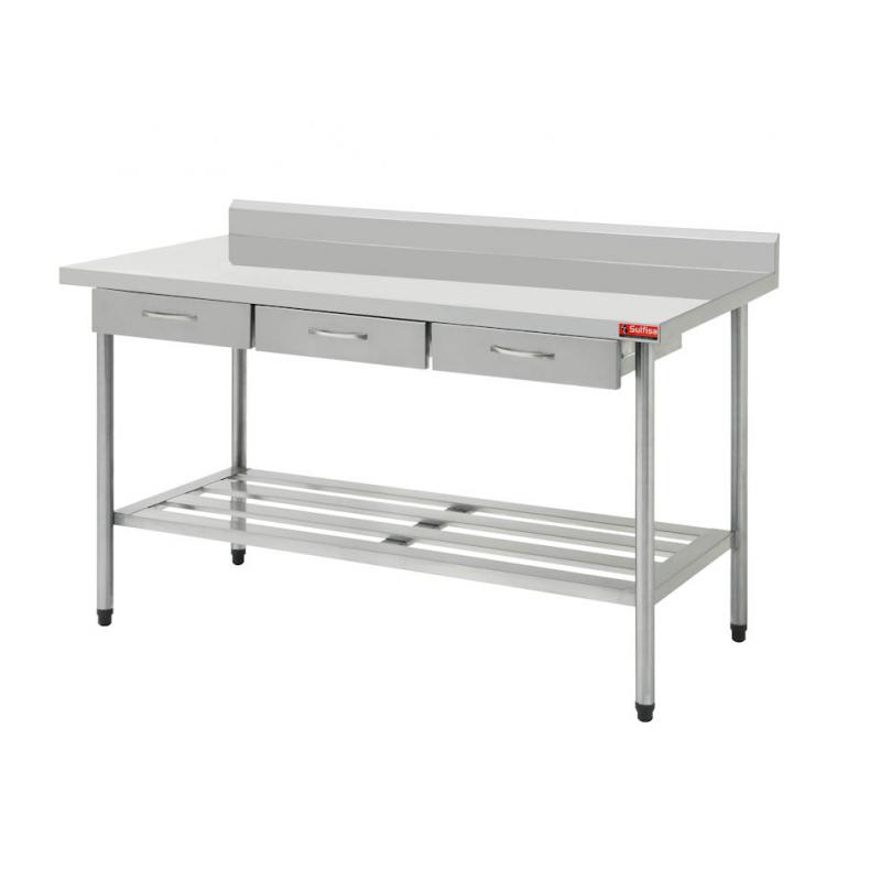 Construída inteiramente em aço inox AISI 430 ou 304, pés de 38mm de diâmetro com sapatas niveladoras em polietileno, tampo liso e prateleira lisa, gradeada ou contraventada em "H". Gavetas removíveis com sistema de trilhos telescópicos e puxador.