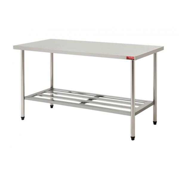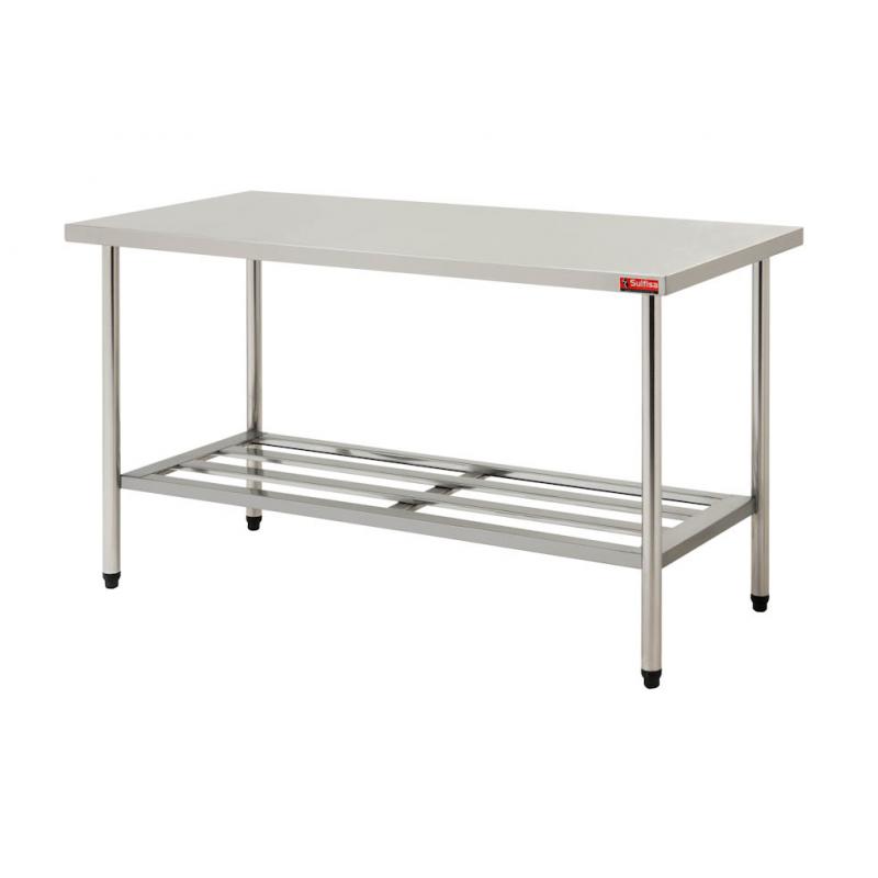 Construída inteiramente em aço inox AISI 430 ou 304, pés de 38mm de diâmetro com sapatas niveladoras em polietileno, tampo liso e prateleira gradeada.