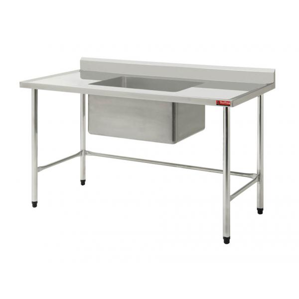 Construída inteiramente em aço inoxidável AISI 304, pés tubulares com sapatas niveladoras em polietileno, tampo com espelho traseiro e rebaixe frontal e nas laterais,contraventada em tubos em formato de "U". Cuba montada com furo para valvula americana de 4.1/2".