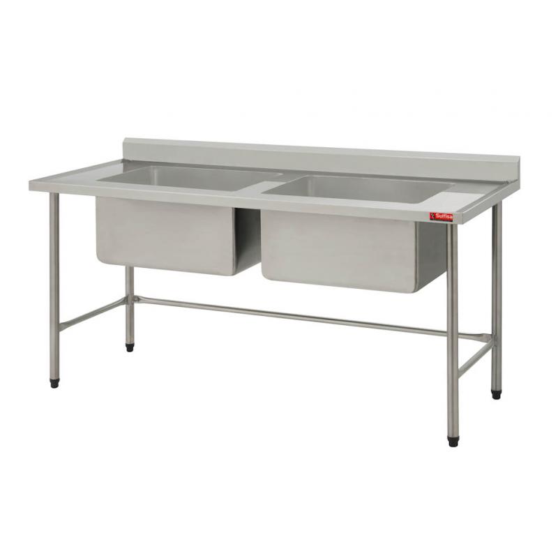Construída inteiramente em aço inoxidável AISI 304, pés tubulares com sapatas niveladoras em polietileno, tampo com espelho traseiro e rebaixe frontal e nas laterais,contraventada em tubos em formato de "U". Cuba montada com furo para valvula americana de 4.1/2".