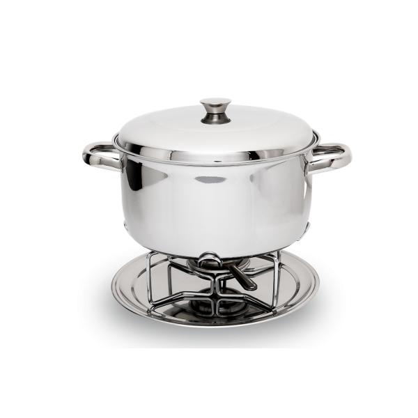 O Rechaud Plátanos tem Caçarola Funda e Tampa de Aço Inox, um material higiênico e neutro, ideal para ser utilizado em contato com os alimentos. Possui capacidade para 5,7 Litros e vem com um Suporte Cromado, um Fogareiro de Aço Inox Menor com Abafador e uma Chapa Difusora de Alumínio. Tudo isso sobre um Prato de Aço Inox com 32 centímetros de diâmetro. Um conjunto completo para servir a comida aquecida e com muita elegância.