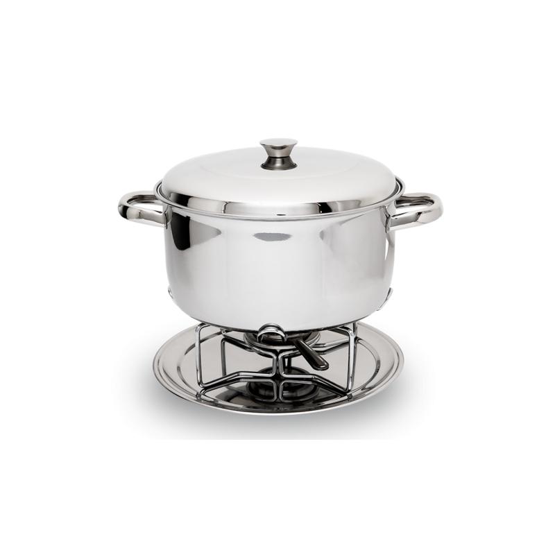 O Rechaud Plátanos tem Caçarola Funda e Tampa de Aço Inox, um material higiênico e neutro, ideal para ser utilizado em contato com os alimentos. Possui capacidade para 8 Litros e vem com um Suporte Cromado, um Fogareiro de Aço Inox Grande com Abafador e uma Chapa Difusora de Alumínio. Tudo isso sobre um Prato de Aço Inox com 32 centímetros de diâmetro. Um conjunto completo para servir a comida aquecida e com muita elegância.