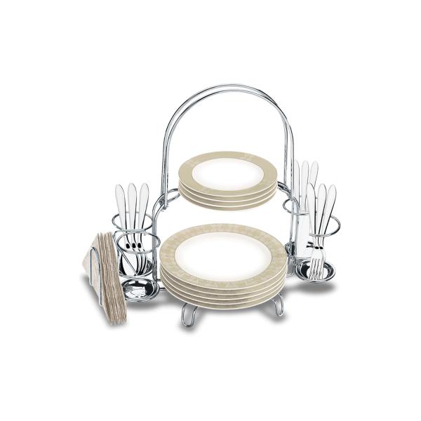Uma mesa elegante merece cuidados em todos os detalhes. O suporte para pratos e talheres da linha Cromados organiza todos os itens da sua mesa em uma única estrutura de aço cromado. A peça tem espaços especialmente desenhados para pratos, pratos de sobremesa, talheres e guardanapos. A alça facilita o manuseio da estrutura e permite que você transporte todos os utensílios necessários para colocar a mesa, de uma só vez. Feito em aço inox, o produto é resistente e fácil de limpar. Além disso, o suporte de pratos e talheres da linha Verona é desmontável. Os utensílios da foto são apenas ilustrativos e não acompanham o produto.