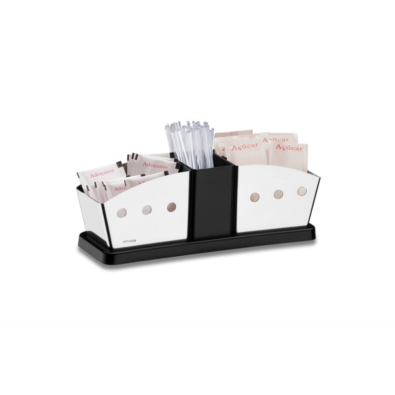 O cantinho do café é sempre muito popular em escritórios. Para manter a organização e limpeza, o suporte para sachês da linha Parma possui três compartimentos especialmente desenhados para embalagens de açúcar, adoçante e palitos para mexer o café. Assim você não corre o risco de perder os pequenos envelopes ou misturar os produtos. Fabricada em ABS e aço inox, a peça é resistente e fácil de limpar. As dimensões do suporte para sachês são 20,5 x 6,5 x 7cm.
